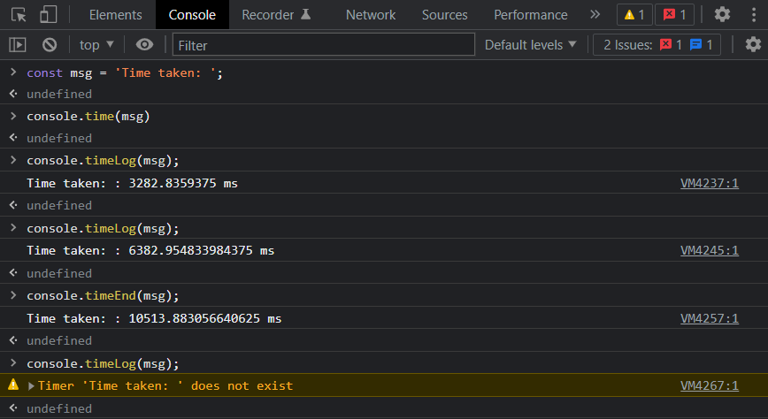 동시에 10000개 정도의 타이머를 한 페이지에서 운영할 수 있다고 합니다. console.time(msg)는 타이머의 시작을 알려주고 console.timeLog(msg)는 시작부터 현재 로그가 출력되는 시점의 시간의 출력해 주며, console.timeEnd(msg)는 타이머를 종료해 줍니다.
