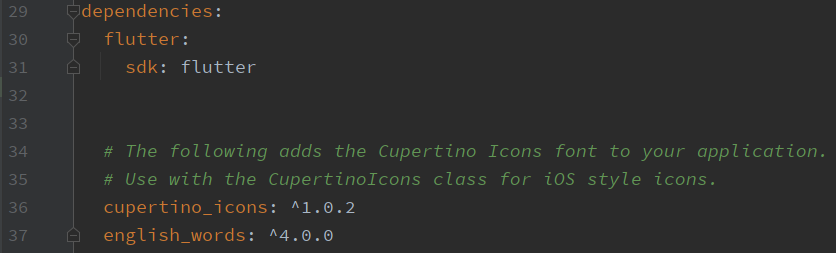 그러면, pubspec.yaml 파일에 다음과 같이 english_words 가 추가된 것을 확인할 수 있습니다.