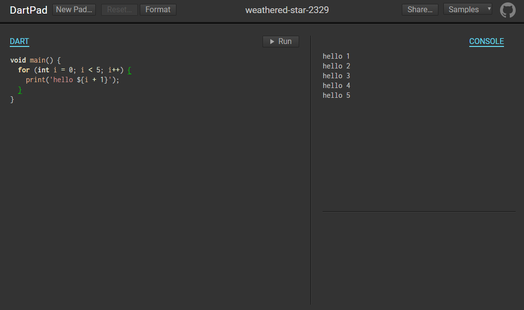 오른쪽 위에 Samples를 클릭하면, Hello World, Int to Double, Mixins, Fibonacci, Sunflower, Websockets 샘플코드를 바로 적용해 볼 수 있으니 한 번 해보셔도 좋을 것 같습니다.