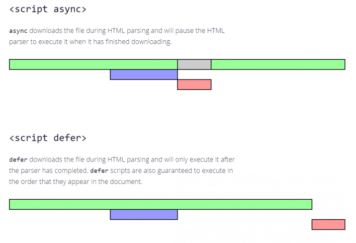 그래서 외부 JavaScript 파일을 head 태그에 넣어 미리 다운로드 받아야 하는 데 이때에는 async와 defer 속성(attribute)를 추가해서 외부파일인 JavaScript를 추가해 주면 위와 같은 문제를 해결할 수 있습니다.