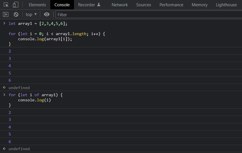 for .. of 구문을 사용할 때에는 array1[i] 할 필요없이 바로 i만 출력해도 인덱스가 아닌 인덱스의 값이 바로 출력이 되는 것을 확인할 수 있습니다.