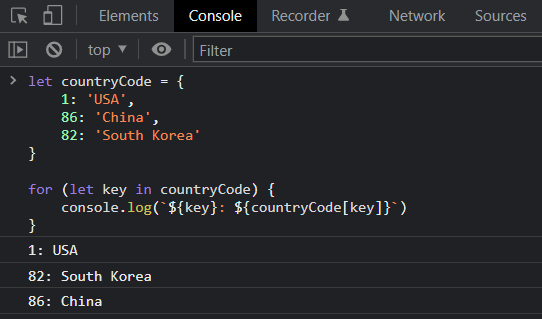 만약 key 값이 숫자로 되어 있다면, 숫자가 작은 것부터 큰 순서대로 차례대로 출력됩니다.