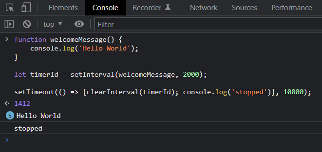 위 코드의 경우, 무한히 함수를 실행하기 때문에 setTimeout과 clearInterval 함수를 사용해서 일정시간이 지난 다음 프로세스를 멈추게 해줍니다.
