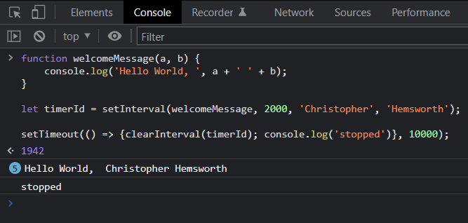 setTimeout(welcomeMessage, 2000, 'Christopher', 'Hemsworth');