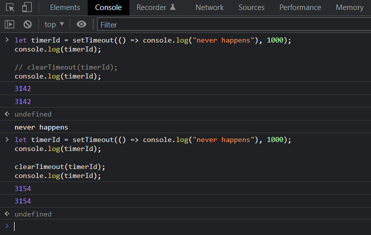 setTimeout을 변수에 할당하는 경우, clearTimeout에 해당 변수를 parameter 값으로 넘기면 함수실행을 실행전에 취소할 수 있습니다.