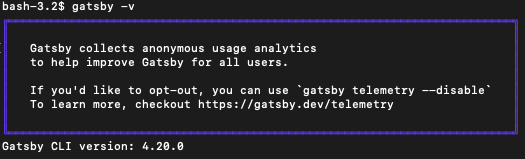설치가 완료되면, 다음 명령어를 통해서 gatsby가 제대로 설치되었는지 확인합니다.