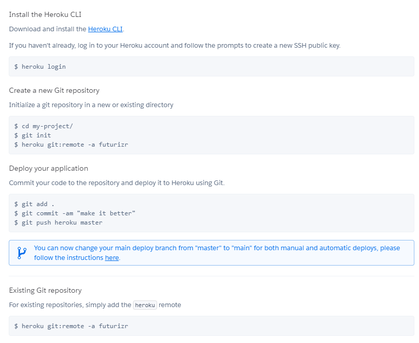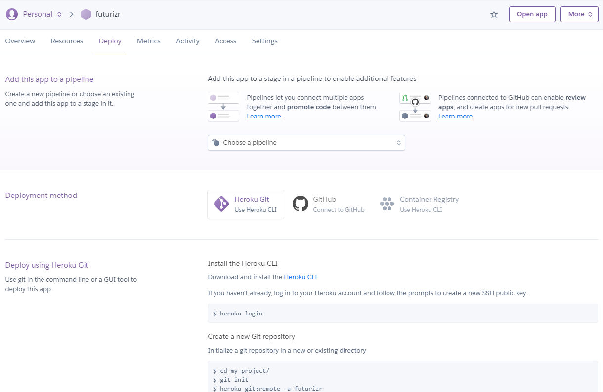 프로젝트 폴더에 들어가서 git을 초기화해주고, heroku cli를 이용해서 git remote를 futurizr app으로 지정해 줍니다.