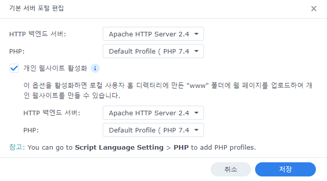 확장 메뉴로 넘어가서 모두 체크 표시한 후 저장 버튼을 클릭하면 Web Station 설정이 끝납니다.