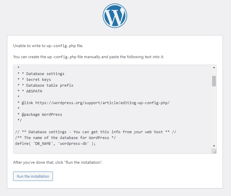 다시 워드프레스 설치로 되돌아와서, Run the installation 버튼을 클릭합니다.
