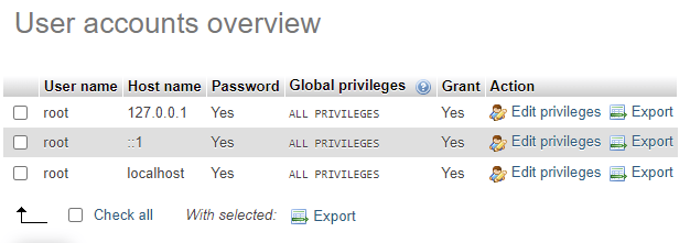phpMyAdmin으로 로그인 한 후 User accounts에서 localhost의 권한 수정(Edit privileges)를 클릭해서 비밀번호를 변경합니다.