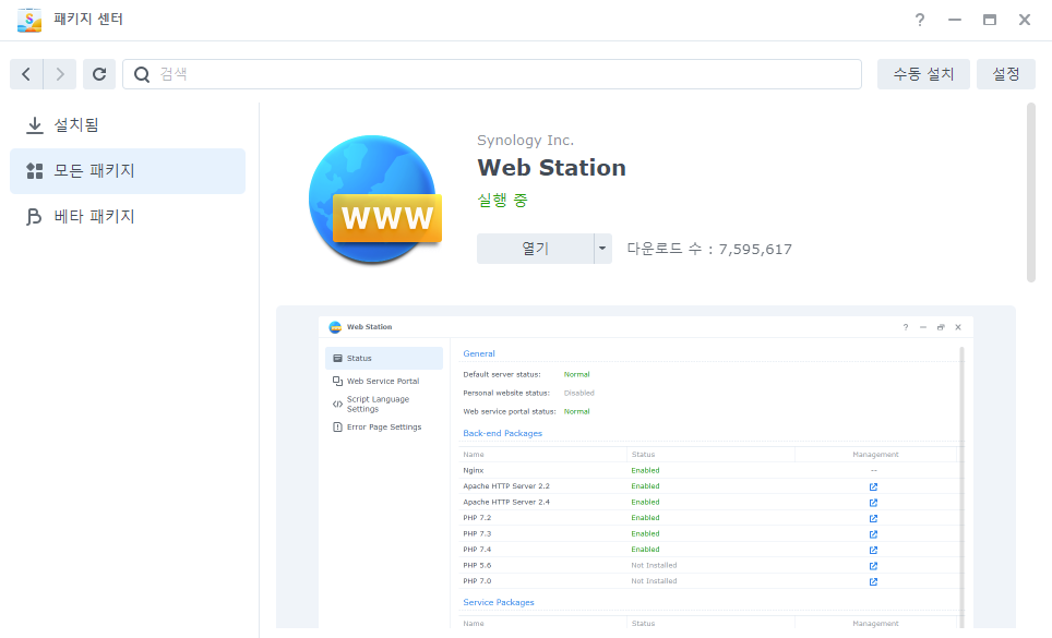 시놀로지 패키지 센터에서 다음 패키지들을 설치합니다.