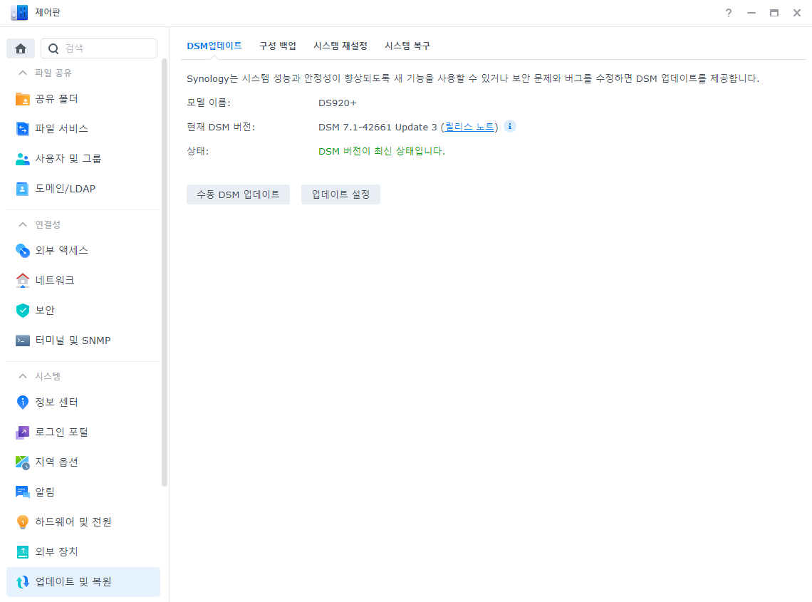 시놀로지의 DSM 버전은 제어판에서 제일 하단에 위치한 업데이트 및 복원 메뉴에서 확인 하실 수 있습니다.
