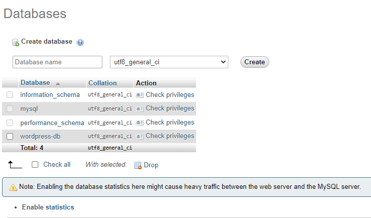 왼쪽 패널에서 New를 클릭해서 워드프레스 데이터베이스(wordpress-db)를 새로 생성합니다.