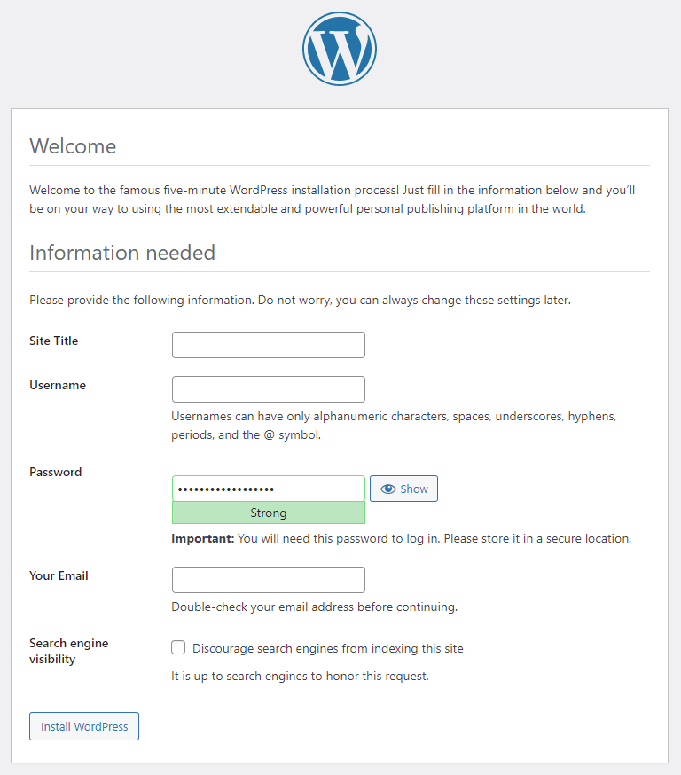 Site Title에 웹사이트 제목을 넣고, Username에 워드프레스 관리자명을 적고, Password에 비밀번호를 생성해서 넣고 이메일을 적어넣고 Install WordPress 버튼을 클릭하면 워드프레스가 설치됩니다.