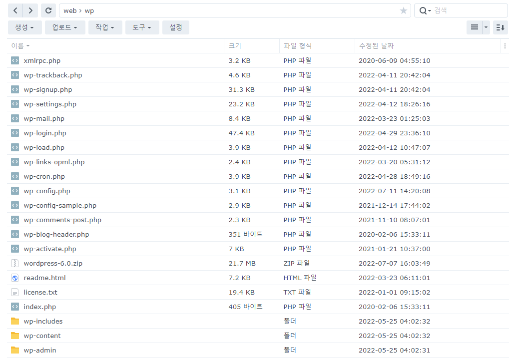 다운로드 받은 워드프레스 압축파일을 web 폴더에 업로드 하고 압축해제 합니다. 그 후 폴더 이름을 원하는 이름으로 변경합니다. 저는 wordpress로 변경했으며, 이 폴더에 워드프레스가 설치 완료되면 도메인 + 폴더이름 경로인 https://syaccount.synology.me/wordpress로 접근이 가능합니다.