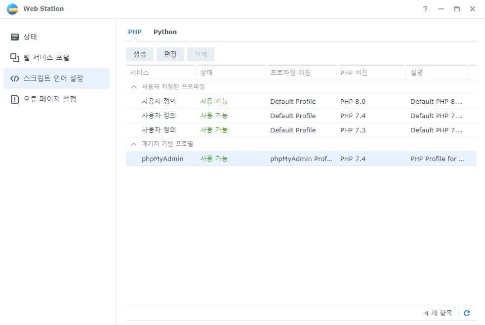 스크립트 언어 설정에서 pypMyAdmin 을 클릭하고 상단의 편집 버튼을 클릭합니다.