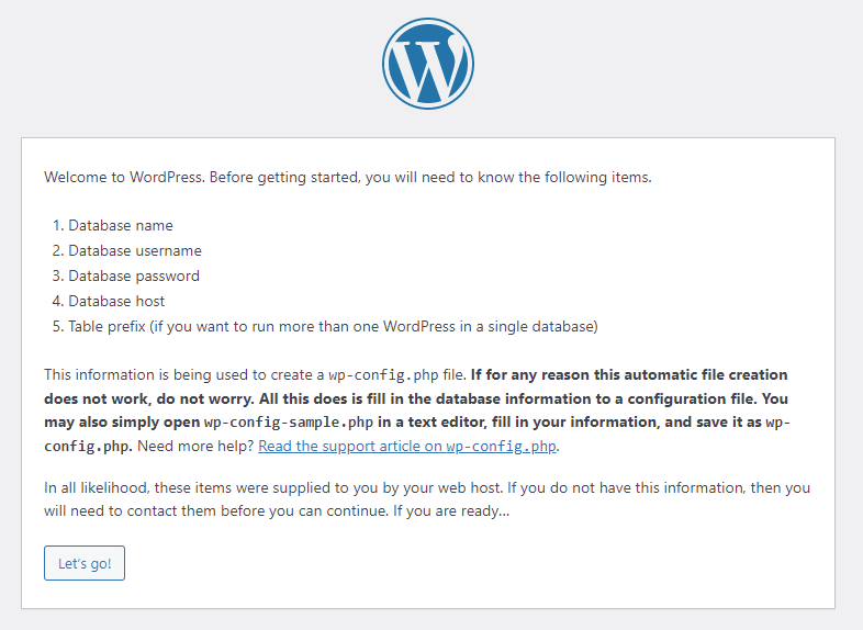위와 같이 에러 화면이 보이면, 해당 스크립트를 복사해놓고 wordpress 설치 파일이 있는 폴더로 가서 wp-config.php 파일을 생성하고, 복사해 놓은 스크립트를 붙여넣기 합니다.