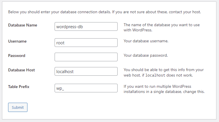 앞에서 설정한 데이터베이스 이름은 wordpress-db 였으며, db 설정시 변경한 Password를 넣고 Submit.버튼을 눌러줍니다.