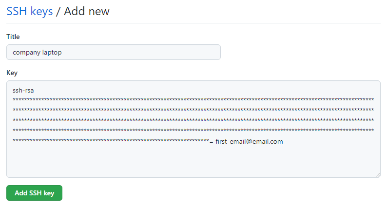$ ssh-keygen -t rsa -C "first-email@email.com" -f "github-first-id"