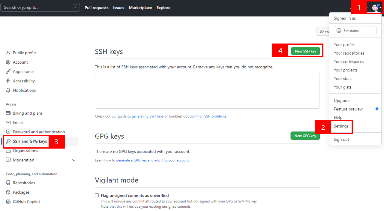 Github의 SSH Key 설정 페이지로 이동합니다.