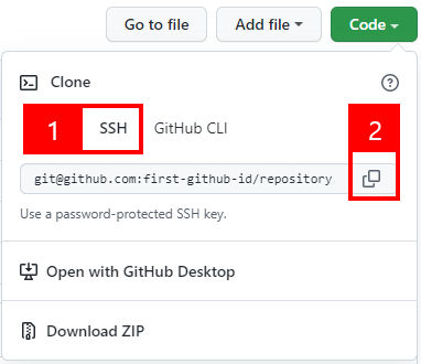 git@github.com-first-github-id:github-account/repository.git 이렇게 변환한 후 git clone 명령어를 사용해서 소스코드를 내려받습니다. 여기서 first-github-id 는 대소문자를 구분하므로 config에 등록된 것과 동일한 id를 사용해야 합니다.