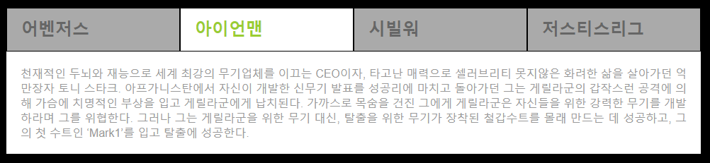 셀러브리티 못지않은 화려한 삶을 살아가던 억만장자 토니 스타크. 아프가니스탄에서