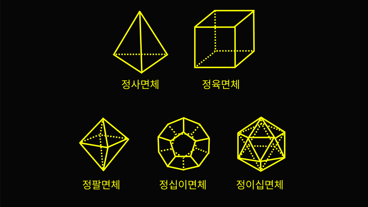 정다면체는 모든 면이 서로 합동인 정다각형이고, 각 꼭지점에 모이는 변의 개수가 모두 같은 다면체로 정사면체, 정육면체, 정팔면체, 정십이면체, 정이십면체 이렇게 5개 종류가 있습니다.