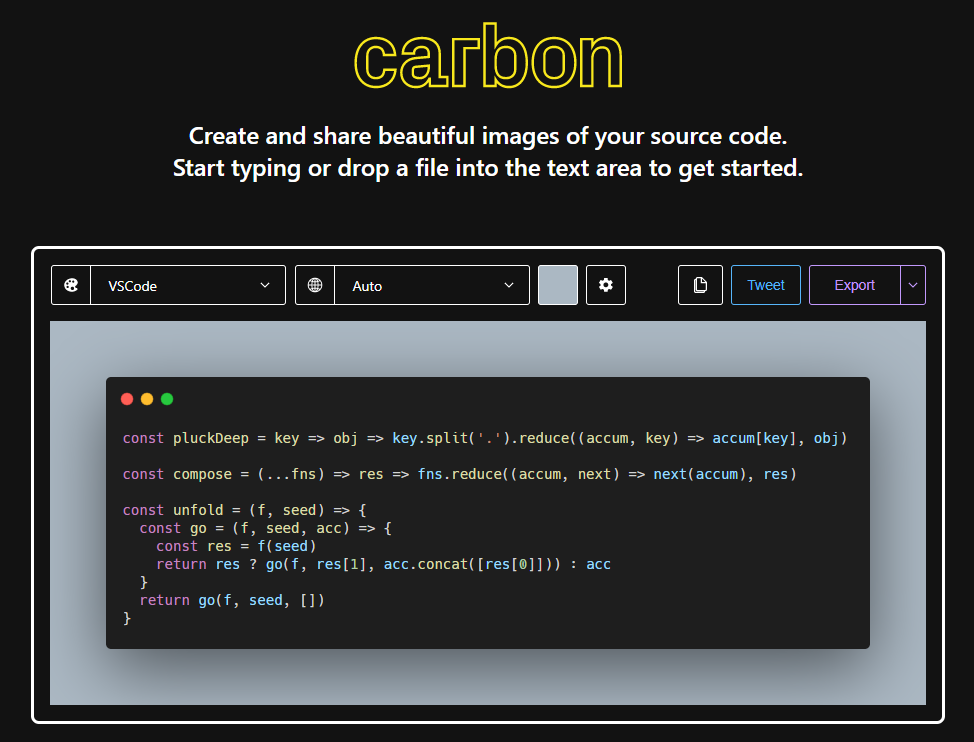 Carbon is the easiest way to create and share beautiful images of your source code.