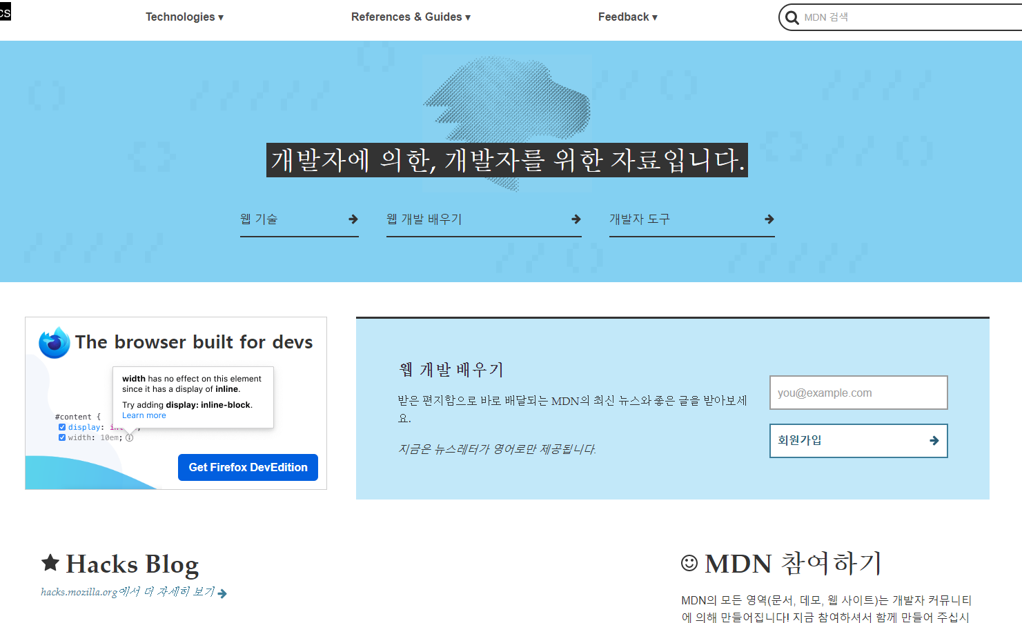 MDN 웹 문서 사이트는 HTML, CSS, 및 웹 사이트와 프로그레시브 웹 앱을 위한 API를 포함한 오픈 웹 기술에 대한 정보를 제공합니다. 또한 Firefox 개발자 도구와 같은 Mozilla 제품을 위한 개발자 지향 문서도 포함합니다.